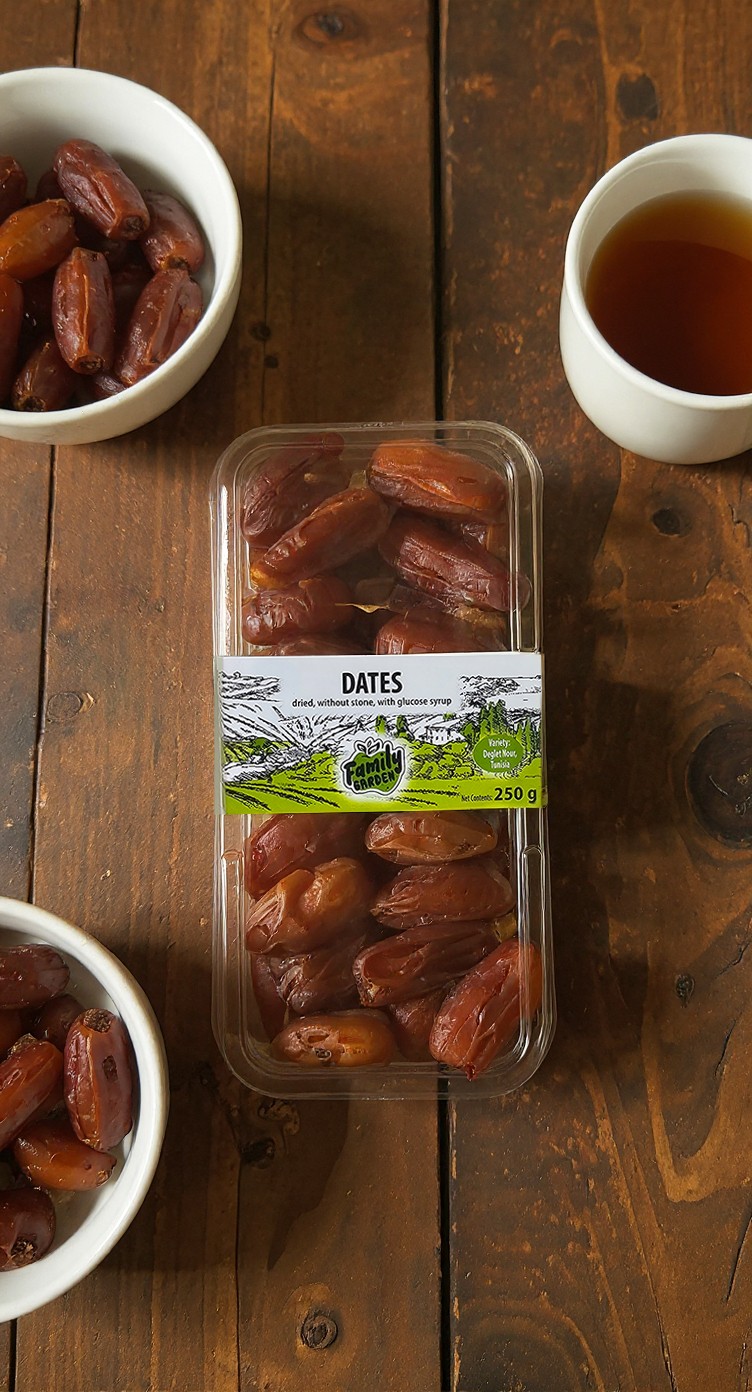 Premium dates — naturally sweet, thoughtfully packed, and available in 200g, 250g, and 400g packs.